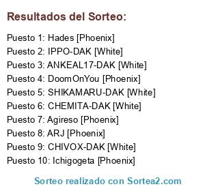 Lista de participantes: Agireso [Phoenix], ARJ [Phoenix], Hades [Phoenix], Ichigogeta [Phoenix], DoomOnYou [Phoenix], CHEMITA-DAK [White], SHIKAMARU-DAK [White], CHIVOX-DAK [White], ANKEAL17-DAK [White], IPPO-DAK [White].