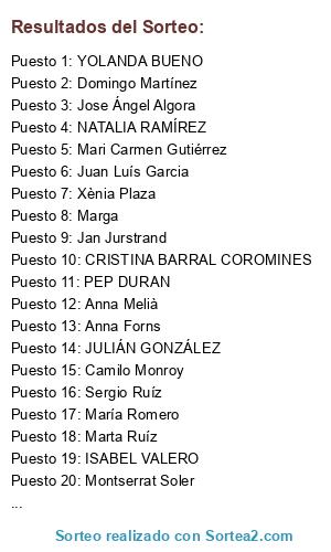 Lista de participantes: YOLANDA BUENO, CRISTINA BARRAL COROMINES, PILAR PUIG, ABEL LACRUZ, NATALIA RAMÍREZ, JULIÁN GONZÁLEZ, RAQUEL NAVAS, ISABEL VALERO, PEP DURAN, Ángeles Cordoba, Manoli Burgos, Montserrat Soler, Camilo Monroy, Neus Lapasset, Xènia Plaza, Anna Forns, Anna Melià, Marta Lopez, Domingo Martínez, Marta Sánchez(2 participaciones), Natalia González, Montserrat Vallvé, Marga, Jan Jurstrand, Marta Ruíz, Juan Luís Garcia, Jose Ángel Algora, Mari Carmen Gutiérrez, Sergio Ruíz, María Romero, Lola Cruz.