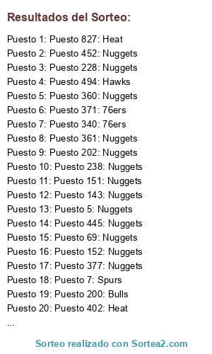 Lista de participantes: Puesto 1: Nuggets, Puesto 2: Nuggets, Puesto 3: Nets, Puesto 4: Nuggets, Puesto 5: Nuggets, Puesto 6: Magic, Puesto 7: Spurs, Puesto 8: Nuggets, Puesto 9: Nuggets, Puesto 10: 76ers, Puesto 11: Nuggets, Puesto 12: 76ers, Puesto 13: Bulls, Puesto 14: Hawks, Puesto 15: Magic, Puesto 16: Heat, Puesto 17: Nuggets, Puesto 18: Nuggets, Puesto 19: Nuggets, Puesto 20: Nuggets, Puesto 21: Nuggets, Puesto 22: Nuggets, Puesto 23: Spurs, Puesto 24: Nuggets, Puesto 25: Nets, Puesto 26: Nets, Puesto 27: Nets, Puesto 28: Nuggets, Puesto 29: 76ers, Puesto 30: Nuggets, Puesto 31: Hawks, Puesto 32: Magic, Puesto 33: Nuggets, Puesto 34: Nuggets, Puesto 35: Spurs, Puesto 36: Spurs, Puesto 37: Nuggets, Puesto 38: Nuggets, Puesto 39: Magic, Puesto 40: Spurs, Puesto 41: 76ers, Puesto 42: Nuggets, Puesto 43: Spurs, Puesto 44: Nuggets, Puesto 45: Bulls, Puesto 46: Nuggets, Puesto 47: Nuggets, Puesto 48: Nuggets, Puesto 49: Nuggets, Puesto 50: 76ers, Puesto 51: Heat, Puesto 52: Heat, Puesto 53: Nuggets, Puesto 54: Nuggets, Puesto 55: Nuggets, Puesto 56: Nuggets, Puesto 57: Nuggets, Puesto 58: Spurs, Puesto 59: Nuggets, Puesto 60: Nuggets, Puesto 61: Nuggets, Puesto 62: Nuggets, Puesto 63: Spurs, Puesto 64: Nuggets, Puesto 65: Nuggets, Puesto 66: Nuggets, Puesto 67: Nuggets, Puesto 68: Nuggets, Puesto 69: Nuggets, Puesto 70: Spurs, Puesto 71: Heat, Puesto 72: Nuggets, Puesto 73: Nuggets, Puesto 74: Nuggets, Puesto 75: Nuggets, Puesto 76: Nuggets, Puesto 77: Hawks, Puesto 78: Nuggets, Puesto 79: Nuggets, Puesto 80: Nuggets, Puesto 81: Nuggets, Puesto 82: Nuggets, Puesto 83: Nuggets, Puesto 84: Nuggets, Puesto 85: Nuggets, Puesto 86: Magic, Puesto 87: Spurs, Puesto 88: Nuggets, Puesto 89: Nuggets, Puesto 90: Nuggets, Puesto 91: Nuggets, Puesto 92: Nuggets, Puesto 93: Bulls, Puesto 94: Nuggets, Puesto 95: Spurs, Puesto 96: Nuggets, Puesto 97: Nuggets, Puesto 98: Bulls, Puesto 99: Nuggets, Puesto 100: Nuggets, Puesto 101: Nuggets, Puesto 102: Heat, Puesto 103: Nuggets, Puesto 104: Nuggets, Puesto 105: Magic, Puesto 106: Nuggets, Puesto 107: Nuggets, Puesto 108: Nuggets, Puesto 109: 76ers, Puesto 110: Magic, Puesto 111: Nuggets, Puesto 112: Nuggets, Puesto 113: Nuggets, Puesto 114: Heat, Puesto 115: Nuggets, Puesto 116: Nuggets, Puesto 117: Nuggets, Puesto 118: Nuggets, Puesto 119: Magic, Puesto 120: Nuggets, Puesto 121: Nuggets, Puesto 122: Nuggets, Puesto 123: Nets, Puesto 124: Nuggets, Puesto 125: Nuggets, Puesto 126: Bulls, Puesto 127: Nuggets, Puesto 128: 76ers, Puesto 129: Spurs, Puesto 130: Spurs, Puesto 131: 76ers, Puesto 132: Nuggets, Puesto 133: Nuggets, Puesto 134: Nuggets, Puesto 135: Nets, Puesto 136: Hawks, Puesto 137: Hawks, Puesto 138: Nuggets, Puesto 139: Hawks, Puesto 140: Nuggets, Puesto 141: Nets, Puesto 142: Heat, Puesto 143: Nuggets, Puesto 144: Nuggets, Puesto 145: 76ers, Puesto 146: Nuggets, Puesto 147: Nuggets, Puesto 148: Nuggets, Puesto 149: Nuggets, Puesto 150: Nuggets, Puesto 151: Nuggets, Puesto 152: Nuggets, Puesto 153: Nuggets, Puesto 154: Heat, Puesto 155: Nets, Puesto 156: Nuggets, Puesto 157: Heat, Puesto 158: Heat, Puesto 159: Heat, Puesto 160: Nuggets, Puesto 161: Nuggets, Puesto 162: Hawks, Puesto 163: Nuggets, Puesto 164: Nets, Puesto 165: Nets, Puesto 166: Spurs, Puesto 167: Nuggets, Puesto 168: Magic, Puesto 169: Bulls, Puesto 170: 76ers, Puesto 171: Nuggets, Puesto 172: Magic, Puesto 173: Magic, Puesto 174: Nuggets, Puesto 175: Bulls, Puesto 176: Magic, Puesto 177: Nuggets, Puesto 178: Magic, Puesto 179: Nuggets, Puesto 180: Nuggets, Puesto 181: Nets, Puesto 182: Magic, Puesto 183: Nuggets, Puesto 184: Hawks, Puesto 185: Nuggets, Puesto 186: Nuggets, Puesto 187: Nets, Puesto 188: Nuggets, Puesto 189: Nuggets, Puesto 190: Nuggets, Puesto 191: Nuggets, Puesto 192: Nuggets, Puesto 193: Nuggets, Puesto 194: Nuggets, Puesto 195: Nuggets, Puesto 196: Nuggets, Puesto 197: Nuggets, Puesto 198: Nuggets, Puesto 199: Nuggets, Puesto 200: Bulls, Puesto 201: Nuggets, Puesto 202: Nuggets, Puesto 203: Nuggets, Puesto 204: Nuggets, Puesto 205: Nuggets, Puesto 206: Nuggets, Puesto 207: Nuggets, Puesto 208: Nuggets, Puesto 209: Nuggets, Puesto 210: Hawks, Puesto 211: Nuggets, Puesto 212: Nuggets, Puesto 213: Nets, Puesto 214: 76ers, Puesto 215: Nuggets, Puesto 216: Nuggets, Puesto 217: Nuggets, Puesto 218: Nuggets, Puesto 219: Heat, Puesto 220: Nuggets, Puesto 221: Nuggets, Puesto 222: Nuggets, Puesto 223: Nuggets, Puesto 224: Nuggets, Puesto 225: Nuggets, Puesto 226: Nets, Puesto 227: Nuggets, Puesto 228: Nuggets, Puesto 229: Magic, Puesto 230: Heat, Puesto 231: Nuggets, Puesto 232: Nuggets, Puesto 233: Bulls, Puesto 234: Nets, Puesto 235: Bulls, Puesto 236: Nets, Puesto 237: Nuggets, Puesto 238: Nuggets, Puesto 239: Magic, Puesto 240: Nuggets, Puesto 241: 76ers, Puesto 242: Nets, Puesto 243: Nuggets, Puesto 244: Nets, Puesto 245: Nuggets, Puesto 246: Nuggets, Puesto 247: Spurs, Puesto 248: Spurs, Puesto 249: Nuggets, Puesto 250: Nuggets, Puesto 251: Nuggets, Puesto 252: Nuggets, Puesto 253: Nuggets, Puesto 254: Nuggets, Puesto 255: Nuggets, Puesto 256: Nuggets, Puesto 257: Nuggets, Puesto 258: Nuggets, Puesto 259: Nuggets, Puesto 260: Magic, Puesto 261: Bulls, Puesto 262: Nets, Puesto 263: Nuggets, Puesto 264: Nuggets, Puesto 265: Bulls, Puesto 266: Hawks, Puesto 267: 76ers, Puesto 268: Magic, Puesto 269: Nuggets, Puesto 270: Nuggets, Puesto 271: Nuggets, Puesto 272: Nuggets, Puesto 273: Nets, Puesto 274: Nuggets, Puesto 275: Nuggets, Puesto 276: Nets, Puesto 277: Magic, Puesto 278: Nets, Puesto 279: Nuggets, Puesto 280: Nuggets, Puesto 281: Bulls, Puesto 282: 76ers, Puesto 283: 76ers, Puesto 284: Bulls, Puesto 285: 76ers, Puesto 286: Nuggets, Puesto 287: Spurs, Puesto 288: Nuggets, Puesto 289: Nuggets, Puesto 290: Nuggets, Puesto 291: 76ers, Puesto 292: Nuggets, Puesto 293: Magic, Puesto 294: Heat, Puesto 295: Heat, Puesto 296: Spurs, Puesto 297: Nuggets, Puesto 298: Magic, Puesto 299: Nets, Puesto 300: Spurs, Puesto 301: Hawks, Puesto 302: Hawks, Puesto 303: Magic, Pue