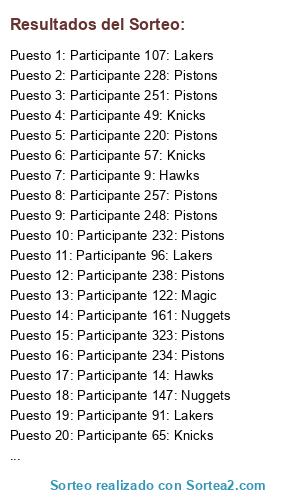 Lista de participantes: Participante 1: Hawks, Participante 2: Hawks, Participante 3: Hawks, Participante 4: Hawks, Participante 5: Hawks, Participante 6: Hawks, Participante 7: Hawks, Participante 8: Hawks, Participante 9: Hawks, Participante 10: Hawks, Participante 11: Hawks, Participante 12: Hawks, Participante 13: Hawks, Participante 14: Hawks, Participante 15: Hawks, Participante 16: Hawks, Participante 17: Hawks, Participante 18: Hawks, Participante 19: Hawks, Participante 20: Hawks, Participante 21: Hawks, Participante 22: Hawks, Participante 23: Hawks, Participante 24: Hawks, Participante 25: Hawks, Participante 26: Heat, Participante 27: Heat, Participante 28: Heat, Participante 29: Heat, Participante 30: Heat, Participante 31: Heat, Participante 32: Heat, Participante 33: Heat, Participante 34: Heat, Participante 35: Heat, Participante 36: Heat, Participante 37: Heat, Participante 38: Heat, Participante 39: Heat, Participante 40: Knicks, Participante 41: Knicks, Participante 42: Knicks, Participante 43: Knicks, Participante 44: Knicks, Participante 45: Knicks, Participante 46: Knicks, Participante 47: Knicks, Participante 48: Knicks, Participante 49: Knicks, Participante 50: Knicks, Participante 51: Knicks, Participante 52: Knicks, Participante 53: Knicks, Participante 54: Knicks, Participante 55: Knicks, Participante 56: Knicks, Participante 57: Knicks, Participante 58: Knicks, Participante 59: Knicks, Participante 60: Knicks, Participante 61: Knicks, Participante 62: Knicks, Participante 63: Knicks, Participante 64: Knicks, Participante 65: Knicks, Participante 66: Knicks, Participante 67: Knicks, Participante 68: Knicks, Participante 69: Knicks, Participante 70: Knicks, Participante 71: Knicks, Participante 72: Knicks, Participante 73: Knicks, Participante 74: Knicks, Participante 75: Knicks, Participante 76: Knicks, Participante 77: Knicks, Participante 78: Knicks, Participante 79: Knicks, Participante 80: Knicks, Participante 81: Knicks, Participante 82: Knicks, Participante 83: Knicks, Participante 84: Knicks, Participante 85: Knicks, Participante 86: Lakers, Participante 87: Lakers, Participante 88: Lakers, Participante 89: Lakers, Participante 90: Lakers, Participante 91: Lakers, Participante 92: Lakers, Participante 93: Lakers, Participante 94: Lakers, Participante 95: Lakers, Participante 96: Lakers, Participante 97: Lakers, Participante 98: Lakers, Participante 99: Lakers, Participante 100: Lakers, Participante 101: Lakers, Participante 102: Lakers, Participante 103: Lakers, Participante 104: Lakers, Participante 105: Lakers, Participante 106: Lakers, Participante 107: Lakers, Participante 108: Lakers, Participante 109: Lakers, Participante 110: Lakers, Participante 111: Lakers, Participante 112: Lakers, Participante 113: Lakers, Participante 114: Magic, Participante 115: Magic, Participante 116: Magic, Participante 117: Magic, Participante 118: Magic, Participante 119: Magic, Participante 120: Magic, Participante 121: Magic, Participante 122: Magic, Participante 123: Magic, Participante 124: Magic, Participante 125: Magic, Participante 126: Magic, Participante 127: Magic, Participante 128: Magic, Participante 129: Magic, Participante 130: Magic, Participante 131: Magic, Participante 132: Magic, Participante 133: Magic, Participante 134: Magic, Participante 135: Magic, Participante 136: Magic, Participante 137: Nuggets, Participante 138: Nuggets, Participante 139: Nuggets, Participante 140: Nuggets, Participante 141: Nuggets, Participante 142: Nuggets, Participante 143: Nuggets, Participante 144: Nuggets, Participante 145: Nuggets, Participante 146: Nuggets, Participante 147: Nuggets, Participante 148: Nuggets, Participante 149: Nuggets, Participante 150: Nuggets, Participante 151: Nuggets, Participante 152: Nuggets, Participante 153: Nuggets, Participante 154: Nuggets, Participante 155: Nuggets, Participante 156: Nuggets, Participante 157: Nuggets, Participante 158: Nuggets, Participante 159: Nuggets, Participante 160: Nuggets, Participante 161: Nuggets, Participante 162: Nuggets, Participante 163: Nuggets, Participante 164: Nuggets, Participante 165: Nuggets, Participante 166: Nuggets, Participante 167: Nuggets, Participante 168: Nuggets, Participante 169: Nuggets, Participante 170: Nuggets, Participante 171: Nuggets, Participante 172: Nuggets, Participante 173: Pistons, Participante 174: Pistons, Participante 175: Pistons, Participante 176: Pistons, Participante 177: Pistons, Participante 178: Pistons, Participante 179: Pistons, Participante 180: Pistons, Participante 181: Pistons, Participante 182: Pistons, Participante 183: Pistons, Participante 184: Pistons, Participante 185: Pistons, Participante 186: Pistons, Participante 187: Pistons, Participante 188: Pistons, Participante 189: Pistons, Participante 190: Pistons, Participante 191: Pistons, Participante 192: Pistons, Participante 193: Pistons, Participante 194: Pistons, Participante 195: Pistons, Participante 196: Pistons, Participante 197: Pistons, Participante 198: Pistons, Participante 199: Pistons, Participante 200: Pistons, Participante 201: Pistons, Participante 202: Pistons, Participante 203: Pistons, Participante 204: Pistons, Participante 205: Pistons, Participante 206: Pistons, Participante 207: Pistons, Participante 208: Pistons, Participante 209: Pistons, Participante 210: Pistons, Participante 211: Pistons, Participante 212: Pistons, Participante 213: Pistons, Participante 214: Pistons, Participante 215: Pistons, Participante 216: Pistons, Participante 217: Pistons, Participante 218: Pistons, Participante 219: Pistons, Participante 220: Pistons, Participante 221: Pistons, Participante 222: Pistons, Participante 223: Pistons, Participante 224: Pistons, Participante 225: Pistons, Participante 226: Pistons, Participante 227: Pistons, Participante 228: Pistons, Participante 229: Pistons, Participante 230: Pistons, Participante 231: Pistons, Participante 232: Pistons, Participante 233: Pistons, Parti