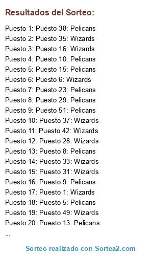 Lista de participantes: Puesto 1: Wizards, Puesto 2: Wizards, Puesto 3: Pelicans, Puesto 4: Wizards, Puesto 5: Pelicans, Puesto 6: Wizards, Puesto 7: Pelicans, Puesto 8: Pelicans, Puesto 9: Pelicans, Puesto 10: Pelicans, Puesto 11: Wizards, Puesto 12: Wizards, Puesto 13: Pelicans, Puesto 14: Wizards, Puesto 15: Pelicans, Puesto 16: Wizards, Puesto 17: Pelicans, Puesto 18: Pelicans, Puesto 19: Wizards, Puesto 20: Pelicans, Puesto 21: Wizards, Puesto 22: Wizards, Puesto 23: Pelicans, Puesto 24: Wizards, Puesto 25: Wizards, Puesto 26: Wizards, Puesto 27: Wizards, Puesto 28: Wizards, Puesto 29: Pelicans, Puesto 30: Pelicans, Puesto 31: Wizards, Puesto 32: Wizards, Puesto 33: Wizards, Puesto 34: Pelicans, Puesto 35: Wizards, Puesto 36: Pelicans, Puesto 37: Wizards, Puesto 38: Pelicans, Puesto 39: Wizards, Puesto 40: Pelicans, Puesto 41: Wizards, Puesto 42: Wizards, Puesto 43: Pelicans, Puesto 44: Pelicans, Puesto 45: Pelicans, Puesto 46: Pelicans, Puesto 47: Wizards, Puesto 48: Wizards, Puesto 49: Wizards, Puesto 50: Wizards, Puesto 51: Pelicans.