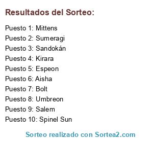 Lista de participantes: Umbreon, Espeon, Sumeragi, Aisha, Salem, Bolt, Mittens, Kirara, Spinel Sun, Sandokán.