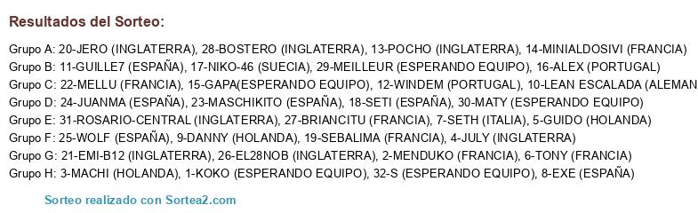 Lista de participantes: 1-KOKO (ESPERANDO EQUIPO), 2-MENDUKO (FRANCIA), 3-MACHI (HOLANDA), 4-JULY (INGLATERRA), 5-GUIDO (HOLANDA), 6-TONY (FRANCIA), 7-SETH (ITALIA), 8-EXE (ESPAÑA), 9-DANNY (HOLANDA), 10-LEAN ESCALADA (ALEMANIA), 11-GUILLE7 (ESPAÑA), 12-WINDEM (PORTUGAL), 13-POCHO (INGLATERRA), 14-MINIALDOSIVI (FRANCIA), 15-GAPA(ESPERANDO EQUIPO), 16-ALEX (PORTUGAL), 17-NIKO-46 (SUECIA), 18-SETI (ESPAÑA), 19-SEBALIMA (FRANCIA), 20-JERO (INGLATERRA), 21-EMI-B12 (INGLATERRA), 22-MELLU (FRANCIA), 23-MASCHIKITO (ESPAÑA), 24-JUANMA (ESPAÑA), 25-WOLF (ESPAÑA), 26-EL28NOB (INGLATERRA), 27-BRIANCITU (FRANCIA), 28-BOSTERO (INGLATERRA), 29-MEILLEUR (ESPERANDO EQUIPO), 30-MATY (ESPERANDO EQUIPO), 31-ROSARIO-CENTRAL (INGLATERRA), 32-S (ESPERANDO EQUIPO).