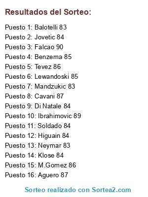 Lista de participantes: Falcao 90, Ibrahimovic 89, Cavani 87, Aguero 87, Tevez 86, M.Gomez 86, Lewandoski 85, Benzema 85, Jovetic 84, Klose 84, Higuain 84, Di Natale 84, Soldado 84, Neymar 83, Balotelli 83, Mandzukic 83.