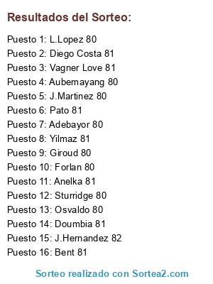 Lista de participantes: J.Hernandez 82, Pato 81, Doumbia 81, Diego Costa 81, Anelka 81, Bent 81, Yilmaz 81, Vagner Love 81, Aubemayang 80, Osvaldo 80, L.Lopez 80, Giroud 80, J.Martinez 80, Forlan 80, Sturridge 80, Adebayor 80.