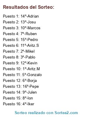 Lista de participantes: 1º-Aritz.M, 2º-Mikel, 3º-Pablo, 4º-Iker, 5º-Gonzalo, 6º-Borja, 7º-Ruben, 8º-Ion, 9º-Julen, 10º-Marcos, 11º-Aritz.S, 12º-Kevin, 13º-Josu, 14º-Adrian, 15º-Pedro, 16º-Pepe.