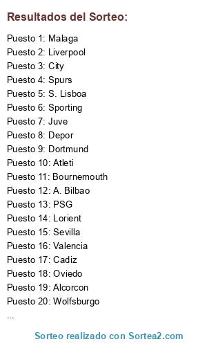 Lista de participantes: Oviedo, Wolfsburgo, Depor, Lorient, Sporting, Brujas, Spurs, City, Cadiz, Villareal, Bournemouth, Alcorcon, Dortmund, Ajax, Sevilla, PSG, Atleti, Betis, Liverpool, S. Lisboa, A. Bilbao, Juve, Malaga, Valencia.
