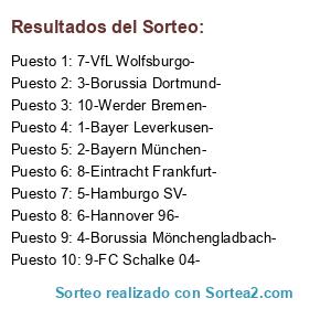 Lista de participantes: 1-Bayer Leverkusen-, 2-Bayern München-, 3-Borussia Dortmund-, 4-Borussia Mönchengladbach-, 5-Hamburgo SV-, 6-Hannover 96-, 7-VfL Wolfsburgo-, 8-Eintracht Frankfurt-, 9-FC Schalke 04-, 10-Werder Bremen-.