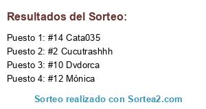 Lista de participantes: #1 Carlotenia, #2 Cucutrashhh, #3 LuCioN, #4 CatWoman, #5 Almenara, #6 Jai, #7 RAULBS, #8 temblexgaleano, #9 Rhea_Silvia, #10 Dvdorca, #11 Earwen, #12 Mónica, #13 Rhea_Silvia, #14 Cata035.