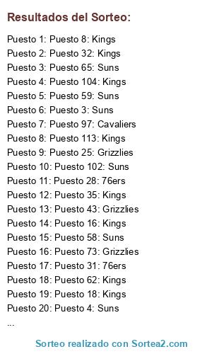 Lista de participantes: Puesto 1: Suns, Puesto 2: Kings, Puesto 3: Suns, Puesto 4: Suns, Puesto 5: 76ers, Puesto 6: Kings, Puesto 7: Grizzlies, Puesto 8: Kings, Puesto 9: Suns, Puesto 10: Cavaliers, Puesto 11: Grizzlies, Puesto 12: Grizzlies, Puesto 13: Cavaliers, Puesto 14: Kings, Puesto 15: Kings, Puesto 16: Kings, Puesto 17: Kings, Puesto 18: Kings, Puesto 19: Grizzlies, Puesto 20: Kings, Puesto 21: Kings, Puesto 22: Suns, Puesto 23: Suns, Puesto 24: Grizzlies, Puesto 25: Grizzlies, Puesto 26: Kings, Puesto 27: Kings, Puesto 28: 76ers, Puesto 29: Cavaliers, Puesto 30: Grizzlies, Puesto 31: 76ers, Puesto 32: Kings, Puesto 33: Grizzlies, Puesto 34: Grizzlies, Puesto 35: Kings, Puesto 36: Grizzlies, Puesto 37: 76ers, Puesto 38: 76ers, Puesto 39: 76ers, Puesto 40: 76ers, Puesto 41: Cavaliers, Puesto 42: 76ers, Puesto 43: Grizzlies, Puesto 44: 76ers, Puesto 45: Cavaliers, Puesto 46: Suns, Puesto 47: Grizzlies, Puesto 48: Grizzlies, Puesto 49: Cavaliers, Puesto 50: Grizzlies, Puesto 51: 76ers, Puesto 52: Kings, Puesto 53: Cavaliers, Puesto 54: Grizzlies, Puesto 55: Kings, Puesto 56: Cavaliers, Puesto 57: 76ers, Puesto 58: Suns, Puesto 59: Suns, Puesto 60: Kings, Puesto 61: Suns, Puesto 62: Kings, Puesto 63: Grizzlies, Puesto 64: Suns, Puesto 65: Suns, Puesto 66: Cavaliers, Puesto 67: Grizzlies, Puesto 68: Suns, Puesto 69: 76ers, Puesto 70: 76ers, Puesto 71: Cavaliers, Puesto 72: Suns, Puesto 73: Grizzlies, Puesto 74: Suns, Puesto 75: Cavaliers, Puesto 76: Kings, Puesto 77: Suns, Puesto 78: 76ers, Puesto 79: Kings, Puesto 80: Suns, Puesto 81: 76ers, Puesto 82: Cavaliers, Puesto 83: Suns, Puesto 84: 76ers, Puesto 85: Suns, Puesto 86: Kings, Puesto 87: Cavaliers, Puesto 88: Kings, Puesto 89: Kings, Puesto 90: Grizzlies, Puesto 91: Cavaliers, Puesto 92: 76ers, Puesto 93: Grizzlies, Puesto 94: Grizzlies, Puesto 95: Cavaliers, Puesto 96: 76ers, Puesto 97: Cavaliers, Puesto 98: Suns, Puesto 99: Suns, Puesto 100: Kings, Puesto 101: Cavaliers, Puesto 102: Suns, Puesto 103: 76ers, Puesto 104: Kings, Puesto 105: Suns, Puesto 106: Grizzlies, Puesto 107: Kings, Puesto 108: Cavaliers, Puesto 109: Kings, Puesto 110: 76ers, Puesto 111: Cavaliers, Puesto 112: 76ers, Puesto 113: Kings, Puesto 114: Suns, Puesto 115: Kings, Puesto 116: Suns.