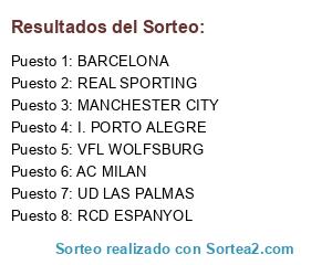 Lista de participantes: REAL SPORTING, VFL WOLFSBURG, BARCELONA, AC MILAN, I. PORTO ALEGRE, UD LAS PALMAS, MANCHESTER CITY, RCD ESPANYOL.