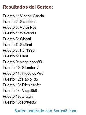 Lista de participantes: Richisanfer, Fabio_85, Vicent_Garcia, S3ector-7, AaronPes, Rvtys86, Seffirot, Wakandu, Zlatan, Fail1993, Angelcoop83, Cipotti, Vega650, FidodidoPes, Selinichef, Unai.