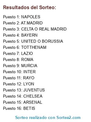 Lista de participantes: MALAGA, SWANSEA, CELTA, INTER DE MILAN, BAYER MUNICH, ARSENAL, LIVERPOOL, UNITED, CHELSEA, RAYO, BETIS, R.MADRID, TOTTHENAM, MURCIA, VENCEDOR JUVE VS MILAN, VENCEDOR ESPAÑOL VS BARCELONA.