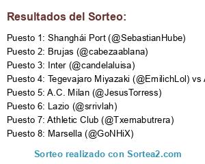 Lista de participantes: Shanghái Port (@SebastianHube), Athletic Club (@Txemabutrera), A.C. Milan (@JesusTorress), Marsella (@GoNHiX), Tegevajaro Miyazaki (@EmilichLol) vs Aberdeen (@jlsierra77), Lazio (@srrivlah), Inter (@candelaluisa), Brujas (@cabezaablana).