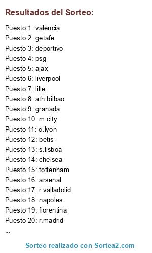 Lista de participantes: fc.barcelona, lille, roma, rayo vallecano, o.lyon, ajax, r.valladolid, panathinaikos, m.city, tottenham, psg, s.lisboa, malaga, napoles, granada, swansea, mallorca, atl.madrid, r.madrid, levante, betis, valencia, inter milan, ath.bilbao, getafe, ac.milan, liverpool, arsenal, juventus, deportivo, fiorentina, chelsea.