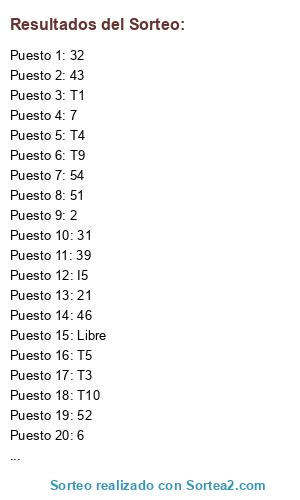 Lista de participantes: T6, 52, 21, 32, 6, T9, T2, 39, T3, 46, I5, T1, 8, 51, 31, 2, T7, T4, 43, T10, 7, 54, T5, Libre.