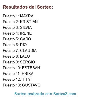 Lista de participantes: TITY(1), KRISTIAN(1), RIO(1), GUSTAVO(1), CARO(1), IRENE(1), LALO(1), MAYRA(1), SILVIA(1), ERIKA(1), ESTEBAN(1), SERGIO(1), CLAUDIA(1).