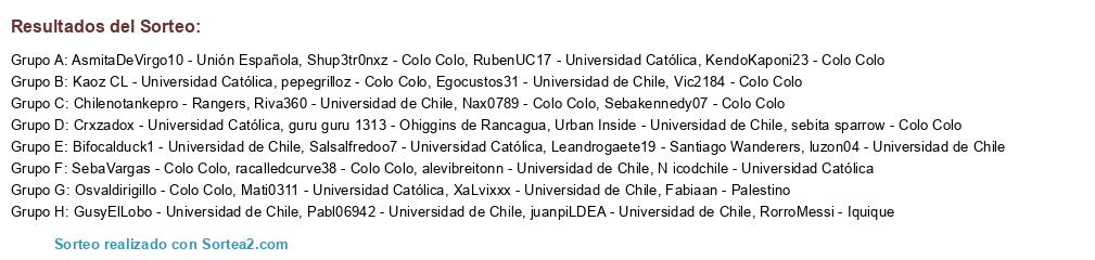 Lista de participantes: KendoKaponi23 - Colo Colo, RubenUC17 - Universidad Católica, racalledcurve38 - Colo Colo, Mati0311 - Universidad Católica, RorroMessi - Iquique, Osvaldirigillo - Colo Colo, Egocustos31 - Universidad de Chile, Pabl06942 - Universidad de Chile, Leandrogaete19 - Santiago Wanderers, XaLvixxx - Universidad de Chile, Shup3tr0nxz - Colo Colo, alevibreitonn - Universidad de Chile, pepegrilloz - Colo Colo, guru guru 1313 - Ohiggins de Rancagua, Salsalfredoo7 - Universidad Católica, AsmitaDeVirgo10 - Unión Española, Vic2184 - Colo Colo, Chilenotankepro - Rangers, Crxzadox - Universidad Católica, Urban Inside - Universidad de Chile, GusyElLobo - Universidad de Chile, Riva360 - Universidad de Chile, Nax0789 - Colo Colo, Sebakennedy07 - Colo Colo, SebaVargas - Colo Colo, juanpiLDEA - Universidad de Chile, Bifocalduck1 - Universidad de Chile, luzon04 - Universidad de Chile, sebita sparrow - Colo Colo, N icodchile - Universidad Católica, Kaoz CL - Universidad Católica, Fabiaan - Palestino.