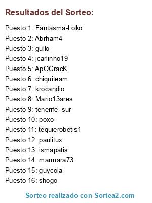 Lista de participantes: marmara73, Abrham4, Fantasma-Loko, tequierobetis1, tenerife_sur, poxo, jcarlinho19, guycola, shogo, paulitux, chiquiteam, ismapatis, krocandio, gullo, Mario13ares, ApOCracK.