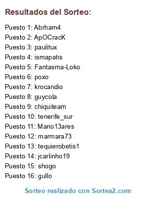 Lista de participantes: marmara73, Abrham4, Fantasma-Loko, tequierobetis1, tenerife_sur, poxo, jcarlinho19, guycola, shogo, paulitux, chiquiteam, ismapatis, krocandio, gullo, Mario13ares, ApOCracK.