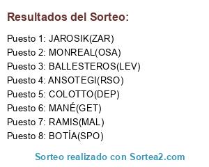 Lista de participantes: RAMIS(MAL), BALLESTEROS(LEV), ANSOTEGI(RSO), MONREAL(OSA), BOTÍA(SPO), COLOTTO(DEP), MANÉ(GET), JAROSIK(ZAR).
