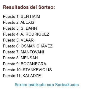 Lista de participantes: S. DANN, MANTOVANI, VLAAR, A. RODRIGUEZ, OSMAN CHÁVEZ, ALEXIS, BEN HAIM, BOCANEGRA, KALADZE, MENSAH, STANKEVICIUS.
