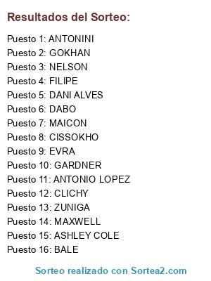 Lista de participantes: DANI ALVES, MAICON, ASHLEY COLE, CISSOKHO, GOKHAN, FILIPE, MAXWELL, BALE, CLICHY, ZUNIGA, DABO, GARDNER, EVRA, ANTONIO LOPEZ, ANTONINI, NELSON.