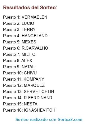 Lista de participantes: LUCIO, MILITO, TERRY, KOMPANY, NESTA, VERMAELEN, MEXES, R.FERDINAND, R.CARVALHO, ALEX, MARQUEZ, CHIVU, SERVET CETIN, IGNASHEVITCH, NATALI, HANGELAND.