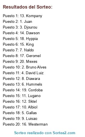 Lista de participantes: AGGER, CRISTIAN ZAPATA, DUNNE, LESCOTT, LEGROTTAGLIE, CAMPAGNARO, MATHIJSEN, HEINZE, HUTH, D. LUGANO, DISTIN, SQUILLACI, BRAMBLE, BURDISSO, BOATENG, SRBONIC, AMOREBIETA, ACERBI, KOSCIELNY, RAÚL ALBIOL, BONUCCI, DEMICHELIS, ASTORI, VAN BUYTEN, MUCKELOAK, DEDÉ, M. CÁCERES.
