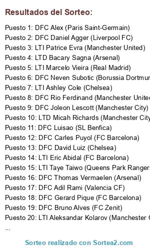 Lista de participantes: DFC Thomas Vermaelen (Arsenal), DFC Joleon Lescott (Manchester City), LTD Álvaro Arbeloa (Real Madrid), DFC William Gallas (Tottenham Hotspur), LTD Daniel Alves (FC Barcelona), DFC Ricardo Carvalho (Real Madrid), DFC Per Mertesacker (Arsenal), DFC Luisao (SL Benfica), LTD Sergio Ramos (Real Madrid), LTI José Enrique (Liverpool FC), DFC Pepe (Real Madrid), LTD Anthony Réveillère (Olympique Lyon), DFC Mamadou Sakho (Paris Saint-Gerain), DFC Nemanja Vidic (Manchester United), LTD Maicon Douglas (FC Internazionale), DFC Thiago Silva (AC Milan), LTI Fábio Coentrao (Real Madrid), DFC Branislav Ivanovic (Chelsea), DFC Giorgio Chiellini (Juventus), LTI Eric Abidal (FC Barcelona), LTI Gael Clichy (Manchester City), DFC Lucio da Silva (FC Internazionale), LTD Ignacio Abate (AC Milan), DFC Bruno Alves (FC Zenit), DFC Carles Puyol (FC Barcelona), DFC Daniel Agger (Liverpool FC), DFC Neven Subotic (Borussia Dortmund), LTD Micah Richards (Manchester City), LTD Bacary Sagna (Arsenal), LTI Aleksandar Kolarov (Manchester City), LTD Glen Jonshon (Liverpool FC), LTI Marcelo Vieira (Real Madrid), LTI Patrice Evra (Manchester United), DFC David Luiz (Chelsea), DFC Rio Ferdinand (Manchester United), DFC Kolo Touré (Manchester City), DFC Mats Hummels (Borussia Dortmund), LTI Ashley Cole (Chelsea), DFC Vicent Kompany (Manchester City), LTI Taye Taiwo (Queens Park Rangers), DFC Raúl Albiol (Real Madrid), LTD Philip Lham (Bayern Munich), LTD José Bosingwa (Chelsea), DFC Adil Rami (Valencia CF), DFC Jhon Terry (Chelsea), DFC Gerard Pique (FC Barcelona), DFC Alex (Paris Saint-Germain), DFC Alessandro Nesta (AC Milan).