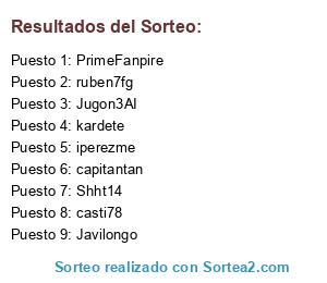 Lista de participantes: Javilongo, ruben7fg, casti78, iperezme, Shht14, PrimeFanpire, capitantan, kardete, Jugon3AI.