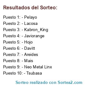 Lista de participantes: - Areides, - Pelayo, - Davitt, - Neo Metal Linx, - Kabron_King, - Lacosa, - Tsubasa, - Mais, - Hojo, - Javiorange.