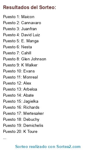 Lista de participantes: Alex, Demichelis, K Toure, Lucio, Jagielka, Mertesaker, Chivu, Cannavaro, Nesta, Maicon, David Luiz, K Walker, E. Manga, J. Boateng, Monreal, José Enrique, Richards, Evans, Abate, Cahill, Juanfran, Arbeloa, Glen Johnson, Debuchy.