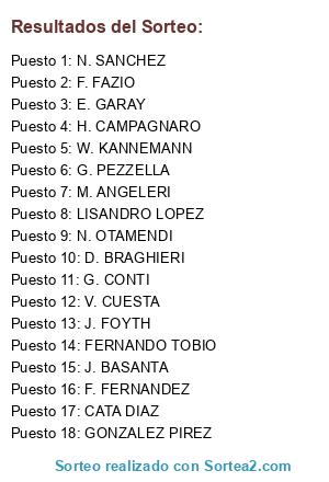 Lista de participantes: G. PEZZELLA, J. FOYTH, E. GARAY, F. FERNANDEZ, H. CAMPAGNARO, FERNANDO TOBIO, V. CUESTA, W. KANNEMANN, J. BASANTA, D. BRAGHIERI, M. ANGELERI, GONZALEZ PIREZ, LISANDRO LOPEZ, F. FAZIO, N. OTAMENDI, N. SANCHEZ, CATA DIAZ, G. CONTI.