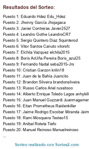 Lista de participantes: Russo Carlos Ariel russitooo, Rami Mosquera Testeo15, Mauro Luciano Iglesias maurolucianoman, Leandro Gothe LeandroCR7, Brandon Silveira brandonsilveira, Elchila Vazquez elchila2015, Javier Contreras Javier2527, Francisco Orellana Galvez francisco-cabj, Eitan Prometheus Raidenkiller, Jhonny García Jhojagaca, Vitor Santos Canuto vitorsfc, Fernando Nadal seba2015-Jrs, Cristian Garzon krilin18, Anibal Roteta Tiefo, Alberto Enrique Toledo Lagos anhykiller, Jaime Rodrigo Escobar Miranda Jaimejames, Eduardo Hdez Edu_Hdez, Juan Manuel Guzzardi Juanmagamer, Juan de la Bahía Juancito, Sergio Quintero Diaz Squinterod, Boris AcUña Pereira Boris_azul25, Rodolfo Henrique rodolfohms, Federico Andres Manzano Ramirez Famr1989, Manuel Reinoso Manuelreinoso.