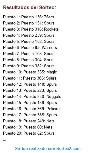 Lista de participantes: Puesto 1: Nets, Puesto 2: Nets, Puesto 3: Spurs, Puesto 4: Rockets, Puesto 5: Warriors, Puesto 6: Spurs, Puesto 7: 76ers, Puesto 8: Nuggets, Puesto 9: Warriors, Puesto 10: Magic, Puesto 11: Spurs, Puesto 12: Spurs, Puesto 13: Spurs, Puesto 14: Spurs, Puesto 15: Rockets, Puesto 16: 76ers, Puesto 17: Spurs, Puesto 18: Nuggets, Puesto 19: Rockets, Puesto 20: Nets, Puesto 21: Spurs, Puesto 22: Spurs, Puesto 23: Rockets, Puesto 24: Spurs, Puesto 25: Pelicans, Puesto 26: 76ers, Puesto 27: Pelicans, Puesto 28: Pelicans, Puesto 29: Magic, Puesto 30: Spurs, Puesto 31: Spurs, Puesto 32: Nets, Puesto 33: Spurs, Puesto 34: Spurs, Puesto 35: Pelicans, Puesto 36: Nuggets, Puesto 37: Spurs, Puesto 38: Nuggets, Puesto 39: Spurs, Puesto 40: Spurs, Puesto 41: Spurs, Puesto 42: Rockets, Puesto 43: Spurs, Puesto 44: Nets, Puesto 45: Spurs, Puesto 46: Spurs, Puesto 47: Spurs, Puesto 48: Spurs, Puesto 49: Spurs, Puesto 50: Spurs, Puesto 51: Warriors, Puesto 52: Nets, Puesto 53: Spurs, Puesto 54: Spurs, Puesto 55: Spurs, Puesto 56: Pelicans, Puesto 57: Rockets, Puesto 58: Spurs, Puesto 59: Spurs, Puesto 60: Nets, Puesto 61: Spurs, Puesto 62: Rockets, Puesto 63: Spurs, Puesto 64: Spurs, Puesto 65: Magic, Puesto 66: Magic, Puesto 67: Spurs, Puesto 68: Spurs, Puesto 69: Spurs, Puesto 70: Spurs, Puesto 71: Spurs, Puesto 72: 76ers, Puesto 73: Spurs, Puesto 74: 76ers, Puesto 75: 76ers, Puesto 76: Spurs, Puesto 77: Spurs, Puesto 78: 76ers, Puesto 79: Nuggets, Puesto 80: Spurs, Puesto 81: Spurs, Puesto 82: Spurs, Puesto 83: Warriors, Puesto 84: Rockets, Puesto 85: Spurs, Puesto 86: Magic, Puesto 87: Warriors, Puesto 88: Spurs, Puesto 89: Spurs, Puesto 90: Pelicans, Puesto 91: Nuggets, Puesto 92: 76ers, Puesto 93: Spurs, Puesto 94: Spurs, Puesto 95: Spurs, Puesto 96: Spurs, Puesto 97: Spurs, Puesto 98: Pelicans, Puesto 99: 76ers, Puesto 100: Spurs, Puesto 101: Spurs, Puesto 102: Spurs, Puesto 103: Spurs, Puesto 104: Spurs, Puesto 105: Spurs, Puesto 106: Warriors, Puesto 107: Spurs, Puesto 108: Nuggets, Puesto 109: Spurs, Puesto 110: Nets, Puesto 111: 76ers, Puesto 112: Spurs, Puesto 113: Spurs, Puesto 114: Nuggets, Puesto 115: Warriors, Puesto 116: Pelicans, Puesto 117: Spurs, Puesto 118: Spurs, Puesto 119: Spurs, Puesto 120: 76ers, Puesto 121: Rockets, Puesto 122: 76ers, Puesto 123: Spurs, Puesto 124: Nets, Puesto 125: 76ers, Puesto 126: Spurs, Puesto 127: Spurs, Puesto 128: Nets, Puesto 129: Spurs, Puesto 130: Spurs, Puesto 131: Spurs, Puesto 132: Spurs, Puesto 133: Rockets, Puesto 134: Spurs, Puesto 135: Nets, Puesto 136: 76ers, Puesto 137: Spurs, Puesto 138: Spurs, Puesto 139: Spurs, Puesto 140: Spurs, Puesto 141: Spurs, Puesto 142: Spurs, Puesto 143: Magic, Puesto 144: Spurs, Puesto 145: Spurs, Puesto 146: Pelicans, Puesto 147: Pelicans, Puesto 148: Spurs, Puesto 149: Warriors, Puesto 150: Spurs, Puesto 151: Magic, Puesto 152: Magic, Puesto 153: 76ers, Puesto 154: Magic, Puesto 155: Spurs, Puesto 156: Nuggets, Puesto 157: Nuggets, Puesto 158: Warriors, Puesto 159: Spurs, Puesto 160: Spurs, Puesto 161: Nets, Puesto 162: Spurs, Puesto 163: 76ers, Puesto 164: Spurs, Puesto 165: Spurs, Puesto 166: Spurs, Puesto 167: Magic, Puesto 168: Pelicans, Puesto 169: Spurs, Puesto 170: Nets, Puesto 171: Warriors, Puesto 172: Spurs, Puesto 173: Spurs, Puesto 174: Spurs, Puesto 175: Nuggets, Puesto 176: Spurs, Puesto 177: Nets, Puesto 178: Nuggets, Puesto 179: Spurs, Puesto 180: Spurs, Puesto 181: Magic, Puesto 182: Spurs, Puesto 183: Spurs, Puesto 184: Nuggets, Puesto 185: Nuggets, Puesto 186: Spurs, Puesto 187: Nets, Puesto 188: Warriors, Puesto 189: Spurs, Puesto 190: Nets, Puesto 191: Nuggets, Puesto 192: Spurs, Puesto 193: Spurs, Puesto 194: Spurs, Puesto 195: Spurs, Puesto 196: Spurs, Puesto 197: Spurs, Puesto 198: Spurs, Puesto 199: Warriors, Puesto 200: 76ers, Puesto 201: Spurs, Puesto 202: Spurs, Puesto 203: Spurs, Puesto 204: Magic, Puesto 205: 76ers, Puesto 206: Spurs, Puesto 207: Spurs, Puesto 208: Spurs, Puesto 209: Spurs, Puesto 210: Spurs, Puesto 211: Spurs, Puesto 212: Spurs, Puesto 213: Spurs, Puesto 214: 76ers, Puesto 215: Magic, Puesto 216: Nuggets, Puesto 217: Spurs, Puesto 218: Spurs, Puesto 219: Spurs, Puesto 220: Spurs, Puesto 221: Pelicans, Puesto 222: Rockets, Puesto 223: Spurs, Puesto 224: Pelicans, Puesto 225: 76ers, Puesto 226: Warriors, Puesto 227: Spurs, Puesto 228: Pelicans, Puesto 229: Spurs, Puesto 230: Nuggets, Puesto 231: Nets, Puesto 232: Spurs, Puesto 233: Spurs, Puesto 234: Spurs, Puesto 235: Spurs, Puesto 236: Spurs, Puesto 237: Spurs, Puesto 238: Spurs, Puesto 239: Spurs, Puesto 240: Rockets, Puesto 241: Rockets, Puesto 242: Spurs, Puesto 243: Rockets, Puesto 244: Spurs, Puesto 245: Nuggets, Puesto 246: Nets, Puesto 247: Warriors, Puesto 248: Rockets, Puesto 249: Nets, Puesto 250: Spurs, Puesto 251: Magic, Puesto 252: Spurs, Puesto 253: Spurs, Puesto 254: Spurs, Puesto 255: Spurs, Puesto 256: Spurs, Puesto 257: Spurs, Puesto 258: Spurs, Puesto 259: Nets, Puesto 260: Spurs, Puesto 261: Spurs, Puesto 262: Nuggets, Puesto 263: Spurs, Puesto 264: Spurs, Puesto 265: Warriors, Puesto 266: 76ers, Puesto 267: 76ers, Puesto 268: Spurs, Puesto 269: Spurs, Puesto 270: Spurs, Puesto 271: Warriors, Puesto 272: Spurs, Puesto 273: Spurs, Puesto 274: Nets, Puesto 275: Spurs, Puesto 276: Spurs, Puesto 277: Warriors, Puesto 278: Spurs, Puesto 279: Nuggets, Puesto 280: Nuggets, Puesto 281: Spurs, Puesto 282: Rockets, Puesto 283: Nuggets, Puesto 284: Spurs, Puesto 285: Spurs, Puesto 286: Magic, Puesto 287: Nets, Puesto 288: Nuggets, Puesto 289: Spurs, Puesto 290: Spurs, Puesto 291: Spurs, Puesto 292: Spurs, Puesto 293: 76ers, Puesto 294: Spurs, Puesto 295: Spurs, Puesto 296: Pelicans, Puesto 297: Spurs, Puesto 298: Magic, Puesto 299: Spurs, Puesto 300: Spurs, Puesto 301: Magic, Puesto 302: Warriors, Puesto 303: Spurs, Puesto 304: Spurs, Puesto 305: Nuggets, Puesto 306: Nets, Puesto 307: Pelicans, Puesto 308: Spurs, Puesto 309: Spurs, Puesto 310: Spurs, Puesto 311: 76ers, Puesto 312: Nets