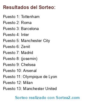 Lista de participantes: Madrid, Arsenal, Zenit, Inter, Chelsea, Tottenham, Olympique de Lyon, Barcelona, Manchester City, Manchester United, Roma, Milan, (josemin).
