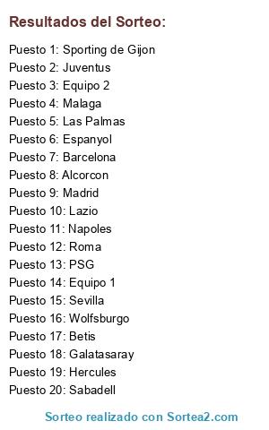 Lista de participantes: Alcorcon, Roma, Sabadell, Barcelona, Galatasaray, Hercules, Juventus, Malaga, Lazio, Betis, Espanyol, Madrid, Sevilla, Napoles, Sporting de Gijon, PSG, Wolfsburgo, Las Palmas, Equipo 1, Equipo 2.