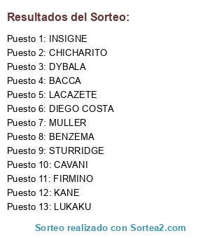 Lista de participantes: FIRMINO, BENZEMA, DYBALA, CAVANI, DIEGO COSTA, MULLER, LACAZETE, LUKAKU, KANE, BACCA, CHICHARITO, INSIGNE, STURRIDGE.