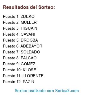 Lista de participantes: CAVANI, GOMEZ, FALCAO, MULLER, DROGBA, HIGUAIN, ZDEKO, LLORENTE, PAZINI, SOLDADO, ADEBAYOR, KLOSE.
