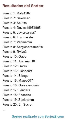 Lista de participantes: Vanmamm, Marpe007, Maza11, Perello, Xernovil, Chisnieto, Rvtys3, Andoni, Xxgutixx, Javiergarcia7, Juanma_10, Zenitramm, Luscoefusco, Tarzandelpro, Exon_Toga, Zeus_Algol, Lionheart, Sergioherasmartin, Siboga, Jusepem, Estupeyonk, Seutito, Lenders, Gorri7, Davies19951995, El_Sucre, A69tepongo, Esancho, Jparram, Gabe, Betikozel, Franmeister, Galesberdurin, Rafa1987, Zanarkanz, Saxoman.