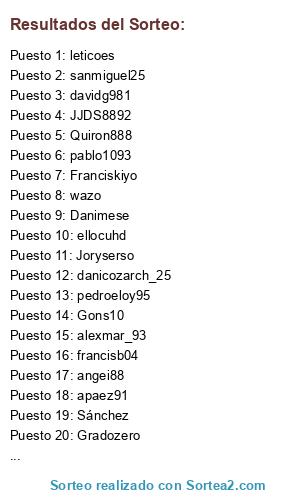 Lista de participantes: Adri_casti90, Josedvd89, enpho, Joryserso, pablo1093, Midaniel3, Danimese, Quiron888, Gons10, francisb04, fornides, apaez91, wazo, referee_21, pedroeloy95, danicozarch_25, mangel.sl, EduCM, Chemita1993, Orbi11, leticoes, JJDS8892, angei88, sito46, davidg981, alexmar_93, ellocuhd, JonanPB8, Uve_mula, sanmiguel25, Franciskiyo, EasyMoney94, Lokikolirota, pombokiller, jaimegx_94, Gradozero, Sánchez, Alberto9.