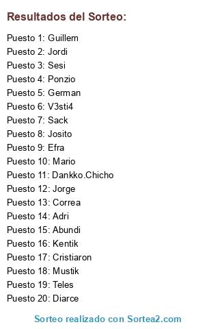 Lista de participantes: Jordi, Mario, German, Josito, Efra, Adri, Correa, Sesi, Kentik, Abundi, V3sti4, Dankko.Chicho, Mustik, Diarce, Sack, Jorge, Guillem, Cristiaron, Ponzio, Teles.