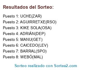 Lista de participantes: WEBÓ(MAL), CAICEDO(LEV), AGUIRRETXE(RSO), KIKE SOLA(OSA), BARRAL(SPO), ADRIÁN(DEP), MANU(GET), UCHE(ZAR).