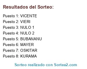 Lista de participantes: BUBANANU, KURAMA, MAYER, VICENTE, OSKITAR, VIERI, NULO 1, NULO 2.