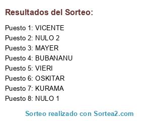 Lista de participantes: BUBANANU, KURAMA, MAYER, VICENTE, OSKITAR, VIERI, NULO 1, NULO 2.