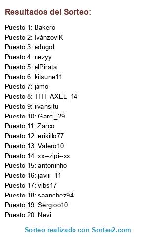 Lista de participantes: javiii_11 , oskis, almarcle, Sergioo10, mark_17, ivancinho004, BRT21, kitsune11, jamo, Ivánzovik, TITI_AXEL_14, Bass120, Fiorano, Sarkus, Oskarjugon, Antoninho, Valero10, Enov, Barambambiron, Zarco, adrian_xta, ivan_9, Nevi, awesomefifa10, aritz1996, juanmasfc, Al_pacino, litos_better, ayo17, klis14.