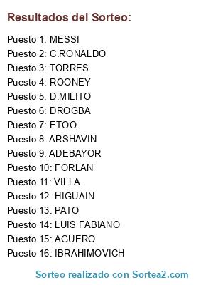 Lista de participantes: C.RONALDO, MESSI, IBRAHIMOVICH, DROGBA, TORRES, LUIS FABIANO, ETOO, ROONEY, AGUERO, D.MILITO, FORLAN, ARSHAVIN, VILLA, PATO, HIGUAIN, ADEBAYOR.