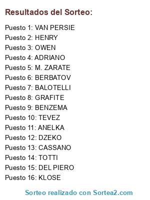 Lista de participantes: TOTTI, CASSANO, KLOSE, TEVEZ, ANELKA, DEL PIERO, BERBATOV, ADRIANO, GRAFITE, M. ZARATE, BALOTELLI, DZEKO, HENRY, VAN PERSIE, BENZEMA, OWEN.