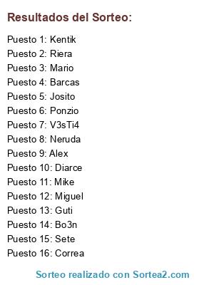 Lista de participantes: Alex, Barcas, Bo3n, Correa, Diarce, Guti, Josito, Kentik, Mario, Mike, Miguel, Neruda, Ponzio, Riera, Sete, V3sTi4.